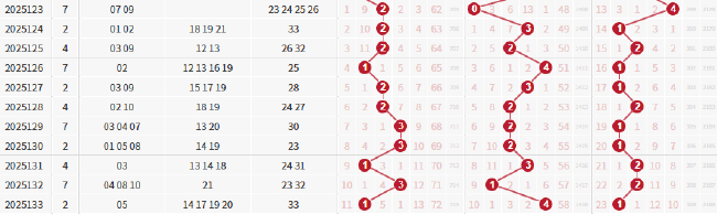 本期奖号还有一大形态引人关注——红球开出2组斜三连码。此项数据在2023年和2024年分别有5次和3次。大罕断区跨度连续2期开出相同数据还算常见,象齐现身下期但连续3期相同就十分特别了。双色